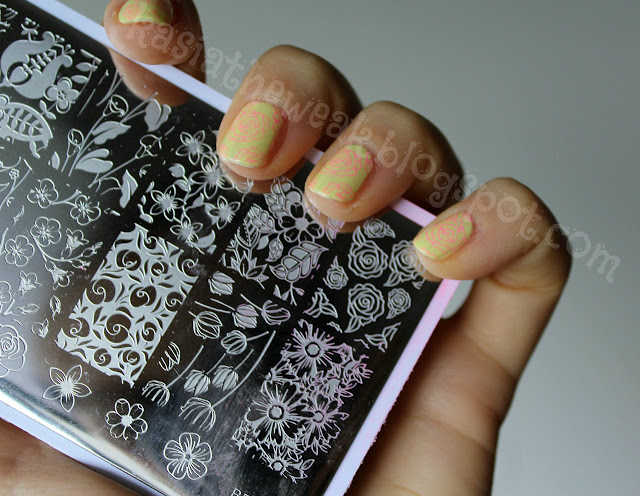 As a base color I used yellow KIKO Quick Dry 853. Then with a pink stamping polish Mundo De Unas 70 Barbie I added a roses pattern from stamping plate BPL-029 which I got from Born Pretty Store. The manicure came out quite delicate, but I think it matches well with tanned skin, so I feel really good with such nails.