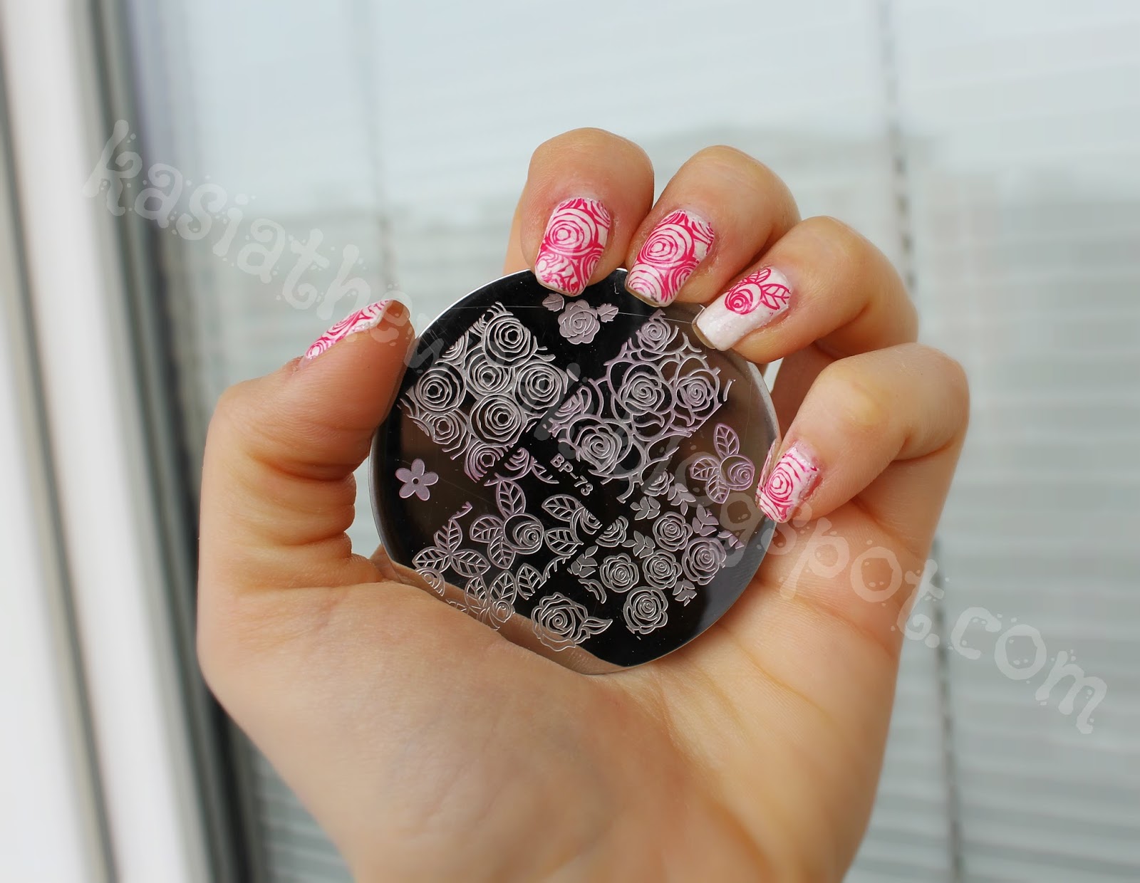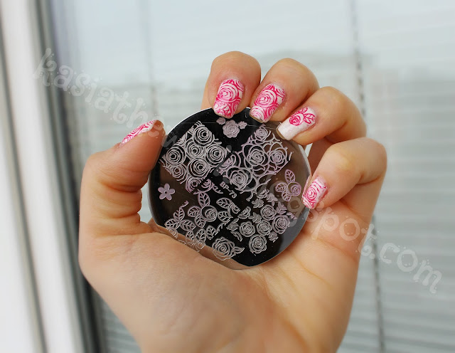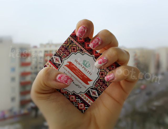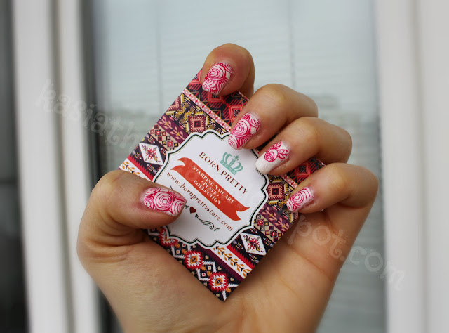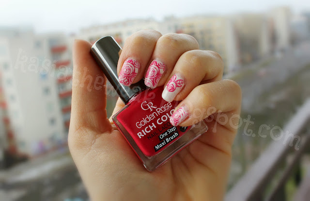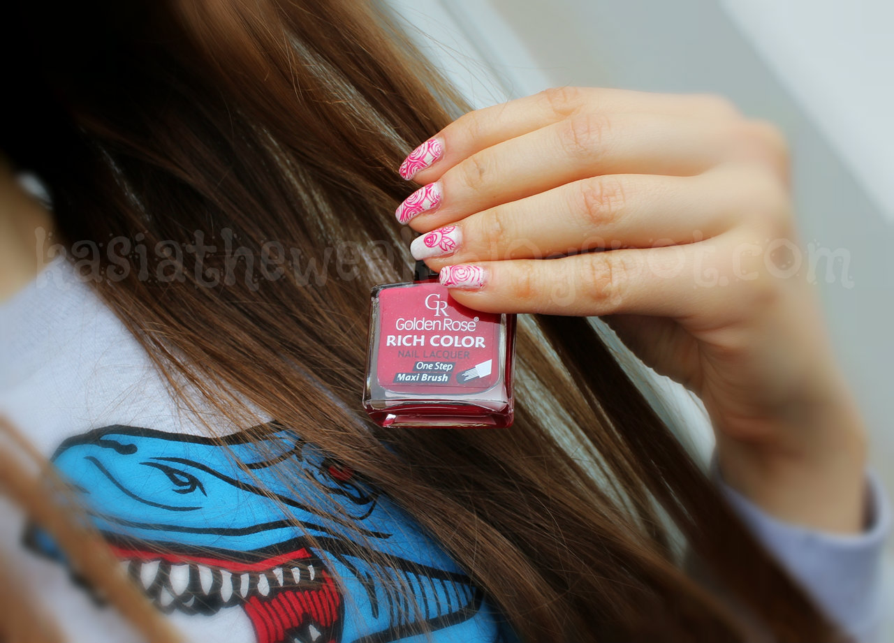 Na początek pomalowałam paznokcie białym lakierem Moyra Sea Salt Pearl Drop (pokażę go samego w osobnym poście). Następnie sięgnęłam po płytkę z Born Pretty Store BP-73 i czerwonym lakierem Golden Rose Rich Color 21 stemplowałam róże. Na koniec na wierzch warstwa topu Seche Vite.