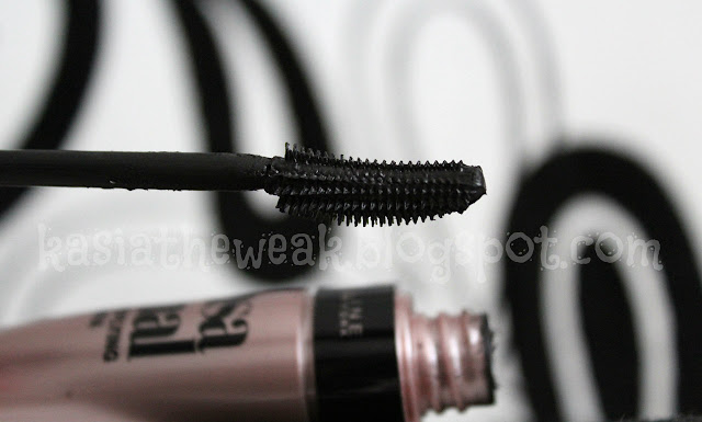 Tusz znajduje się w opakowaniu w kształcie typowym dla Maybelline. Kolor opakowania to taki zgaszony róż, do tego czarne napisy, przez co całość elegancko się prezentuje.